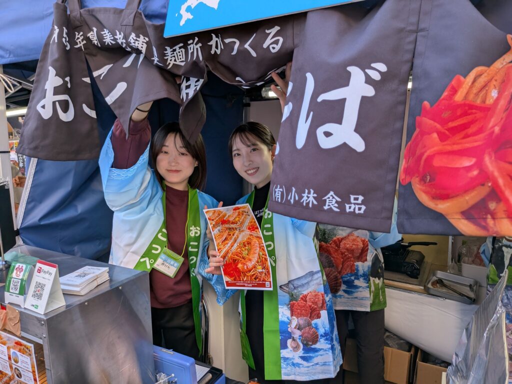 私がお手伝いさせていただいた興部町商工会の小林食品様は興部町特産品の「あらびきソーセージ」をのせた「おこっぺ焼きそば」と、お持ち帰り用の「こんぶらーめん、韃靼そば茶、流氷ラーメン」を販売いたしました。おこっぺ焼きそばは北海道産小麦を100%使用していることでもちもちとした食感でとてもおいしく、意外にもあっさりと食べられる味付けでした。フェアではワンハンドフードが多かったこともありおこっぺ焼きそばは2日目の早い時間に完売しました。そしてゼミ生が呼びかけを積極的にしたこともあってか他の商品もすべて完売することができました!