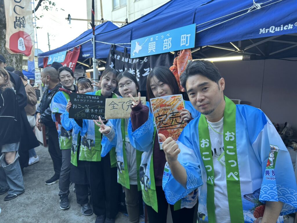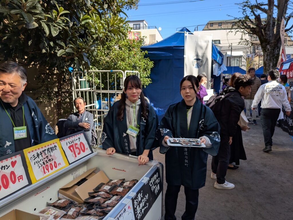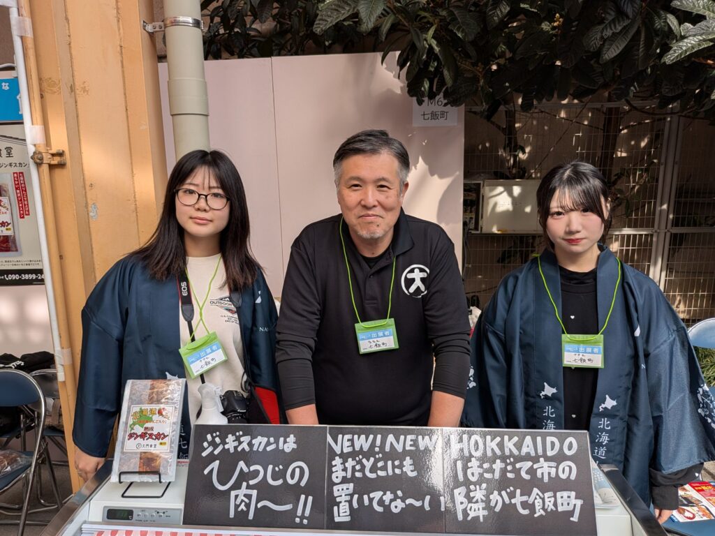 関ゼミ3年生は例年通り三軒茶屋で開催された「なまらいいっしょ北海道フェア2025」(北海道商工会連合会主催)に参加しました。今年はゼミ生19名が興部町(おこっぺちょう)商工会、七飯町(ななえちょう)商工会、湧別町(ゆうべつちょう)商工会のブースに分かれて11月2日(日)・3日(月・祝)の2日間お手伝いをさせていただきました。