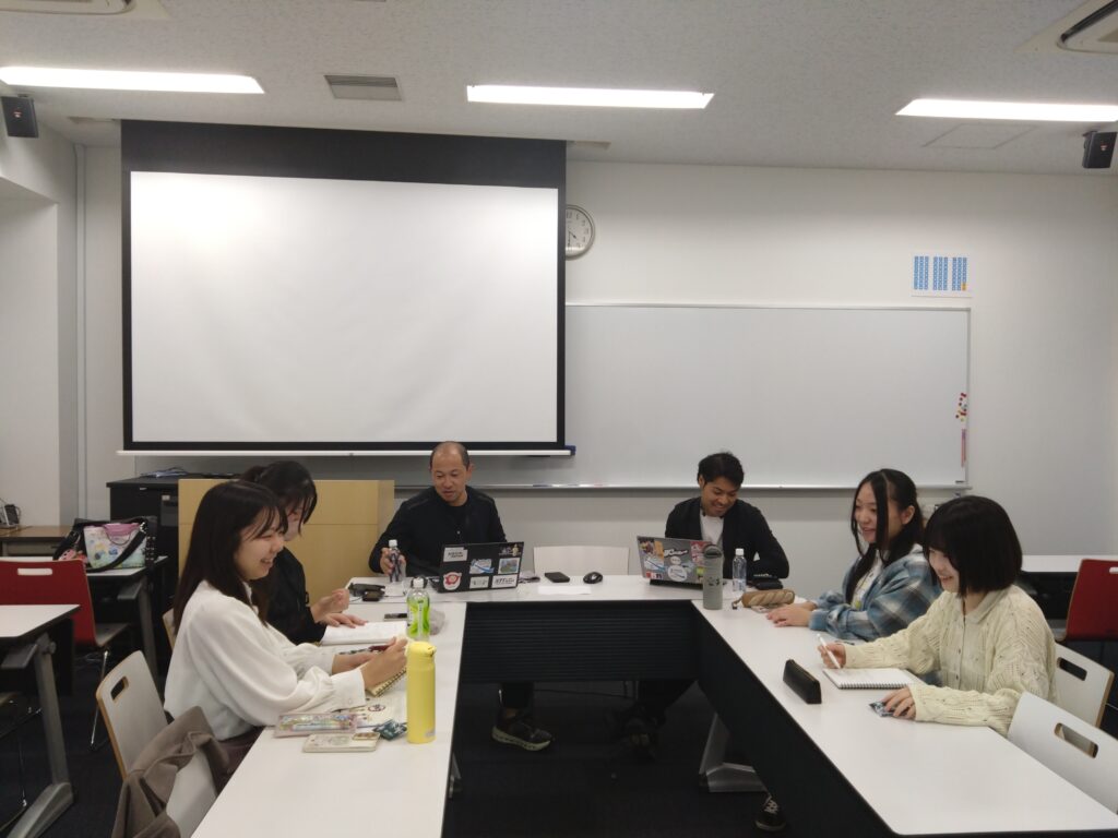 こんにちは!鈴村ゼミの吉野です。私たち3年ゼミ生は、学寮研修中に実施したサブゼミでプロジェクト活動に関する話し合いを終えたあと、先生とともにトランプや雑談で盛り上がるなど、和気藹々としたゼミ活動を行っています。
